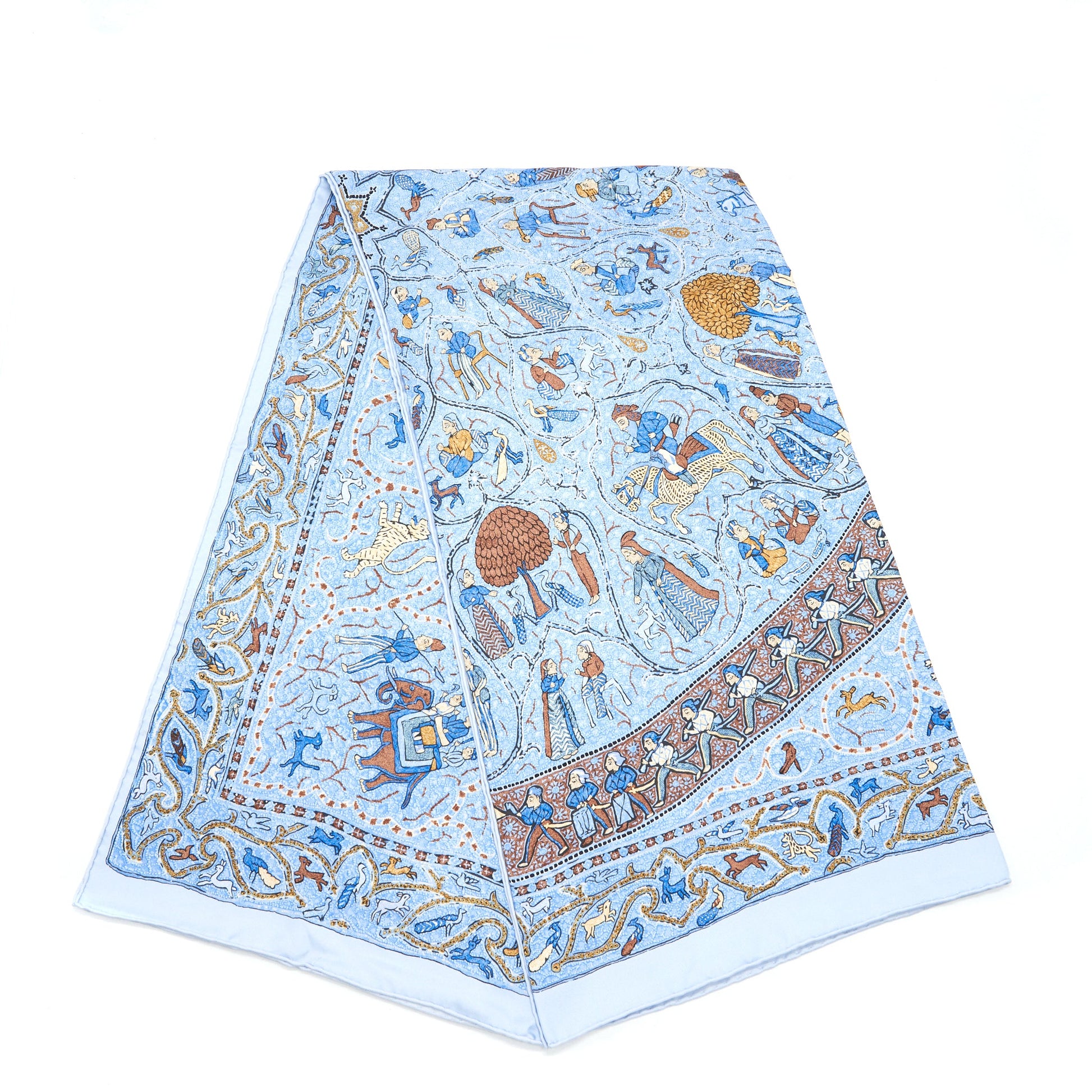 Details: Condition: 9.9 /10 New ( This item is kept unused in New) Colour: Light Blue/Multicoloured Measurement: 140x140 cm Material : 100% Silk Inclusion: Original Box, Photocopy of Receipt