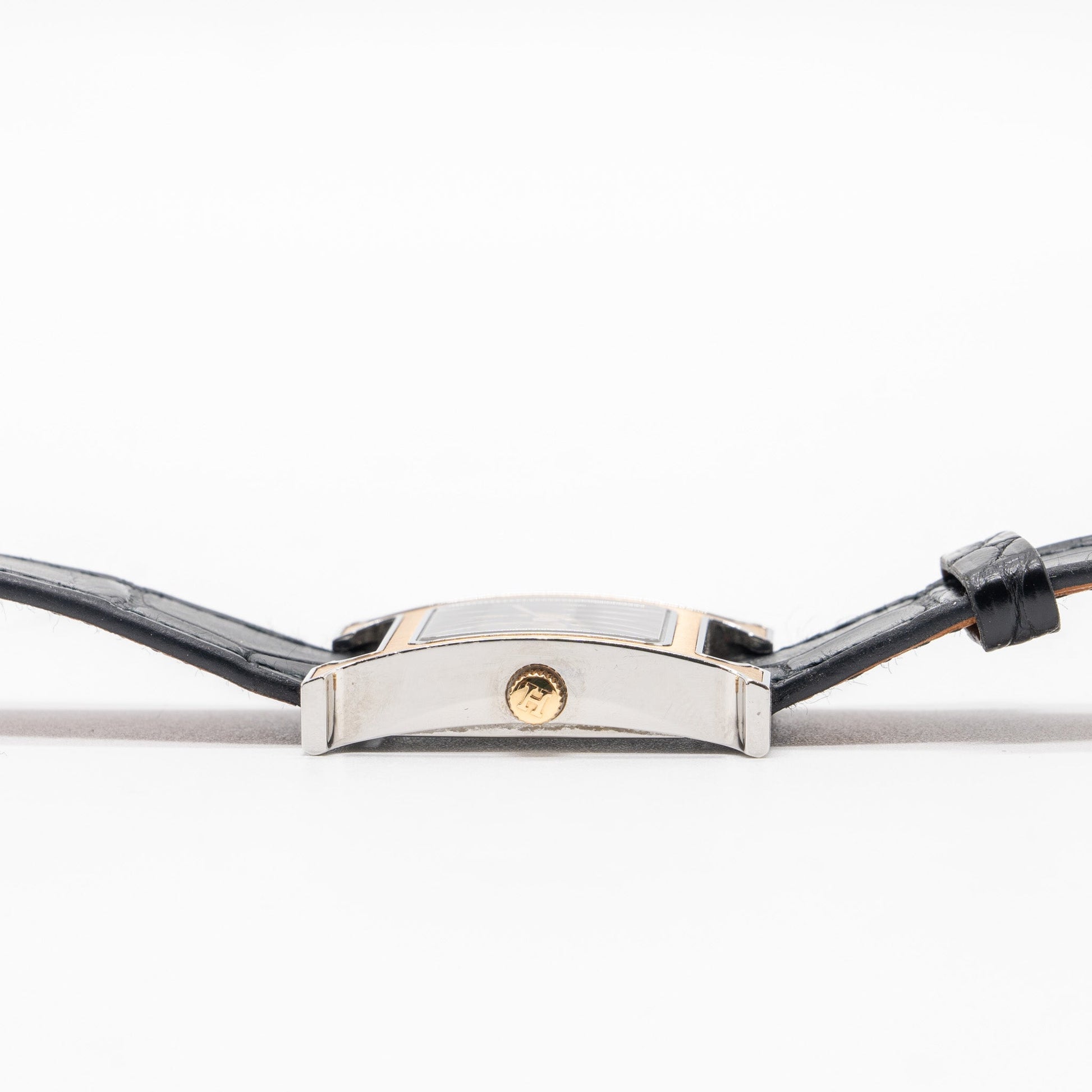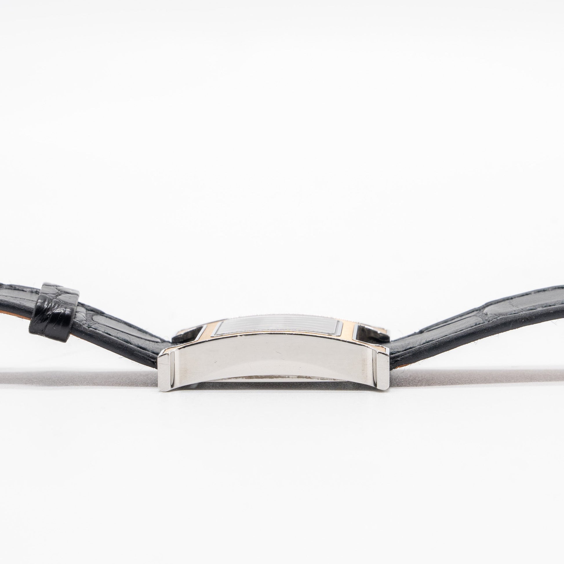 Details: Condition: 9.5/10 Well New (This item is in New condition with s light scratches on hardware, slight colour transfer on strap.) Case: 21 x 21mmStainless Steel Case Wrist Size: 13.5-16.5 cm (We do not offer exchange or refund if the size does not fit. Please contact our sales representative before the purchase for assistant) Glass : Anti-glare sapphire crystal Dial: Black Strap Material: Alligator Leather Water-resistant to : 3 Bar Movement : Quartz Origin: Swiss Made Inclusion :I nner Box, Outer Box, Certificate
