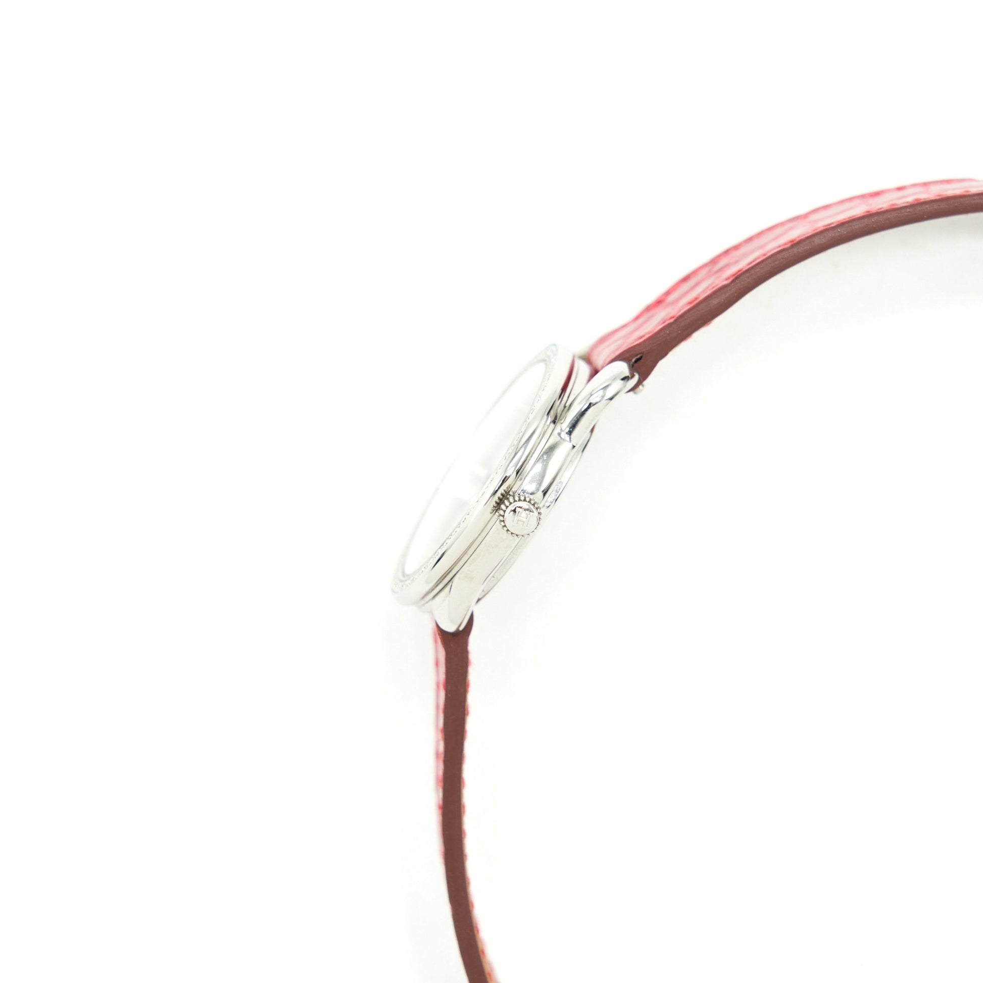 Details: Condition: 9.5 / 10 Gently New (This item is in New condition with slight scratches on hardware.) Case: 28 x 28mmStainless Steel Case Wrist Size: 160-210 mm (We do not offer exchange or refund if the size does not fit. Please contact our sales representative before the purchase for assistant) Glass : Anti-glare sapphire crystal Dial: White Strap Material: Alligator Leather Water-resistant to : 3 Bar Movement : Quartz Origin: Swiss Made Inclusion :Full Set with Citis