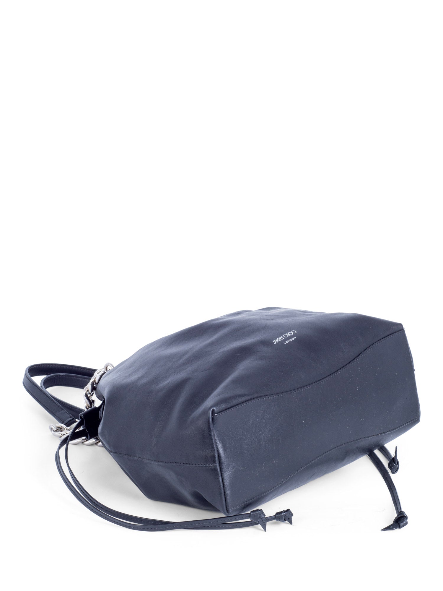 Jimmy Choo Top Handle Bucket Bag or . This Jimmy Choo bag is in black leather with silver hardware and tassel detail on the front. It features drawstring top closure and dual top handles in leather with silver tone chain. This bag opens to grey leather lined interior with one zippered pocket. Made in Italy.