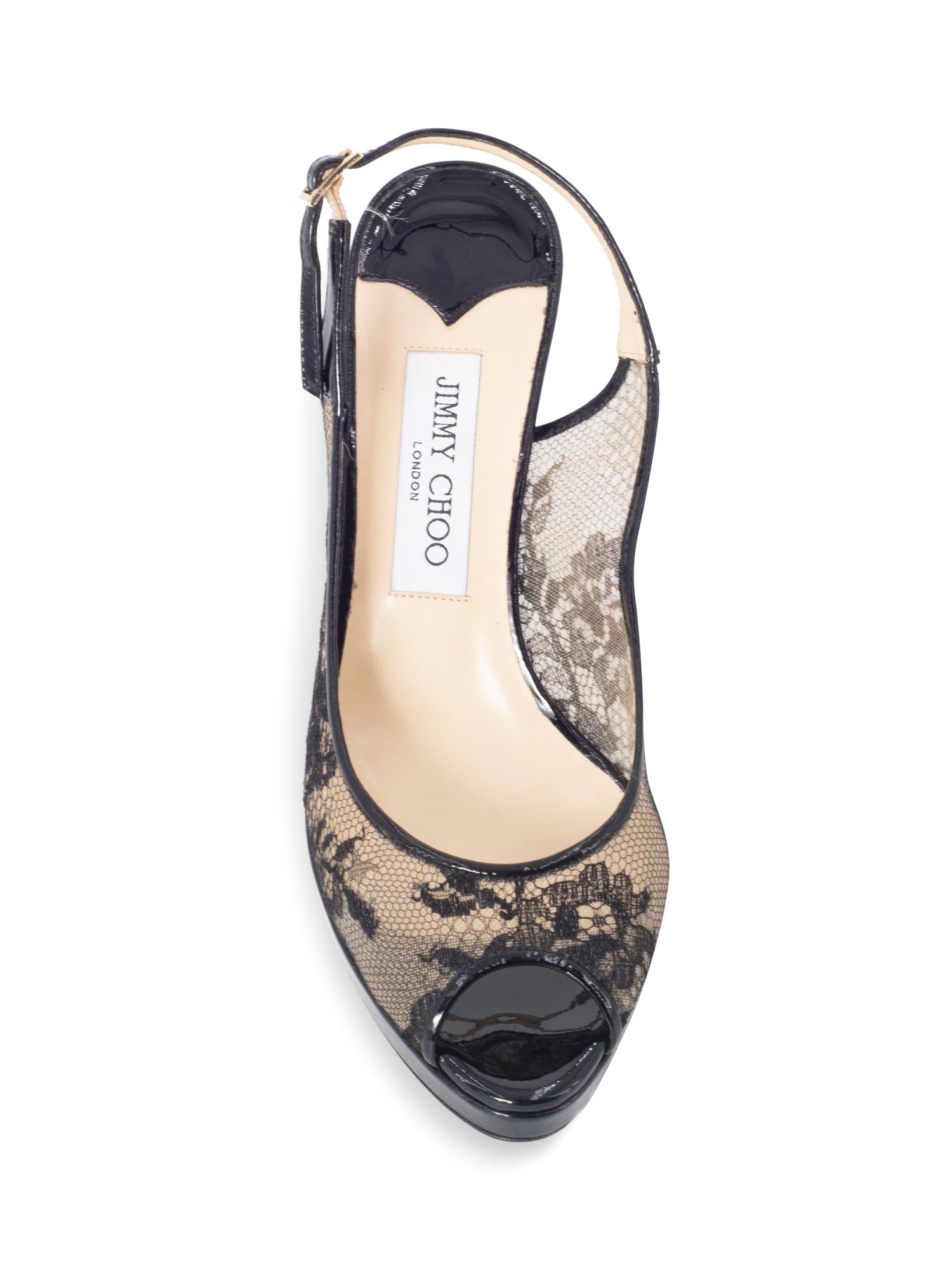 Jimmy Choo Pumps or . These pumps are in black floral mesh and beige with gold-toned hardware. They feature a belt clasp closure, an open toe, and beige exterior sole.
