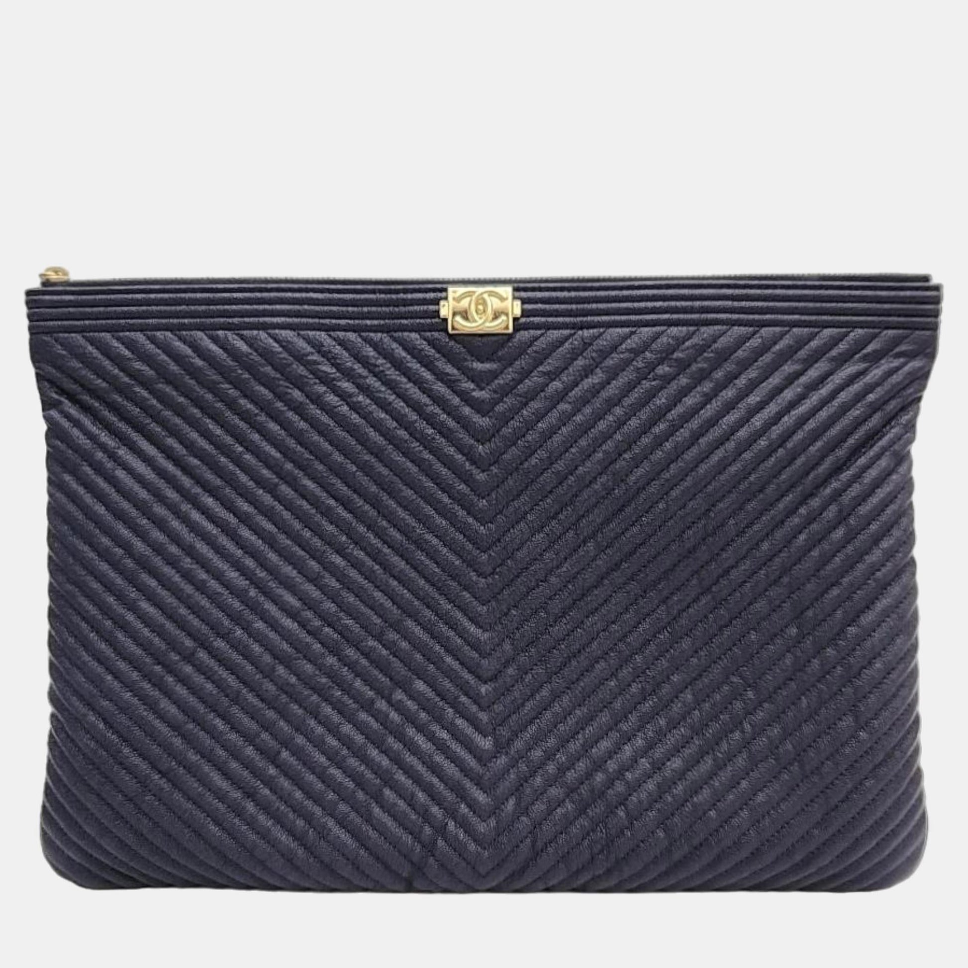 Chanel Navy Blue Caviar Leather Large O Case Boy Clutch Bag