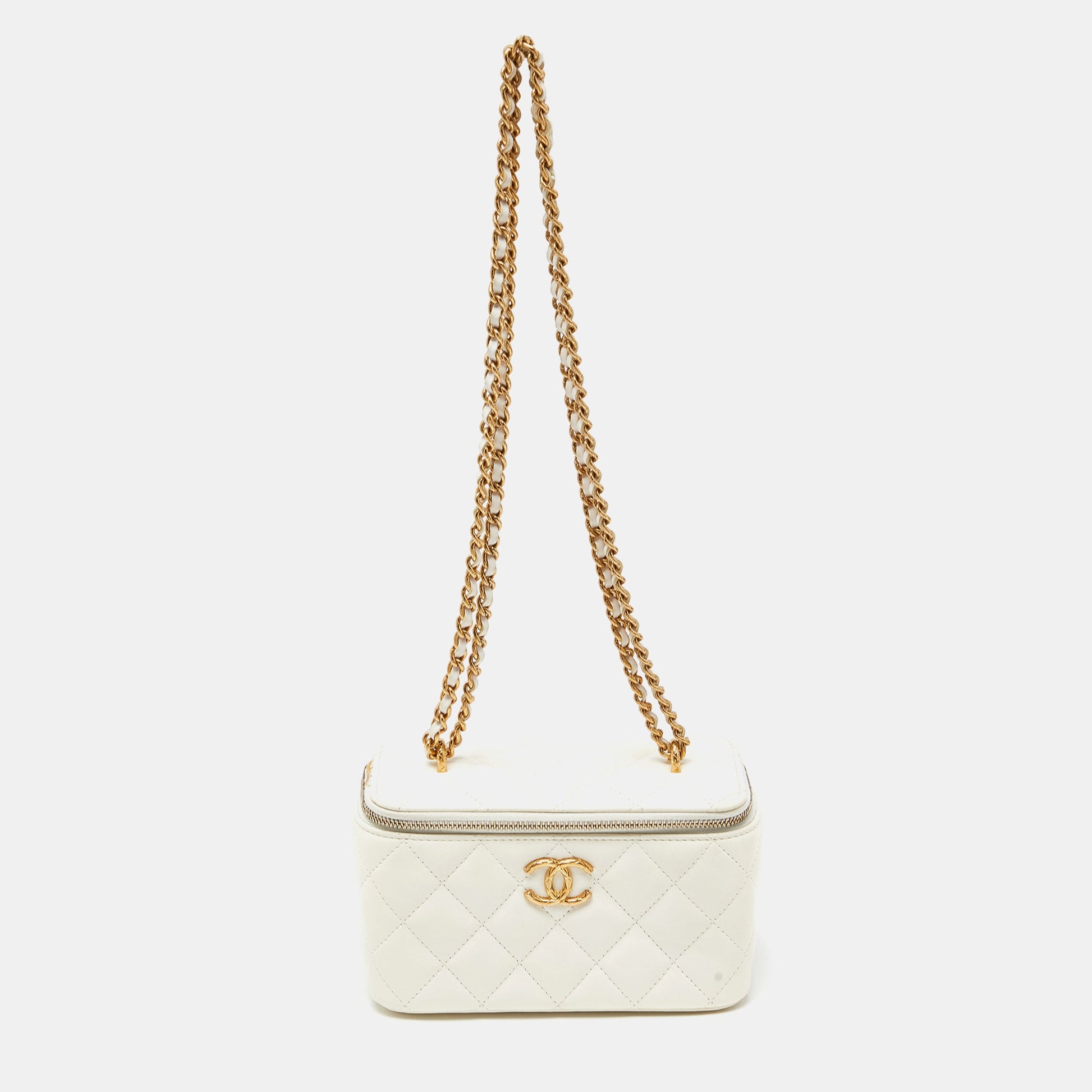 Discover the Chanel Off White Quilted Leather Vanity Case Chain Bag, a stunning addition to the world of designer luxury handbags. Crafted from premium leather, this chic bag combines elegance with practicality, featuring a versatile chain strap for easy wear. When looking to buy luxury handbags online, utilize our price comparison platform to find the best deals on this iconic piece. With Chanel's renowned quality and timeless design, you can trust in the brand's exceptional reputation. Our site provides reliable information to guide your purchase, ensuring you make an informed decision while exploring the world of luxury fashion.