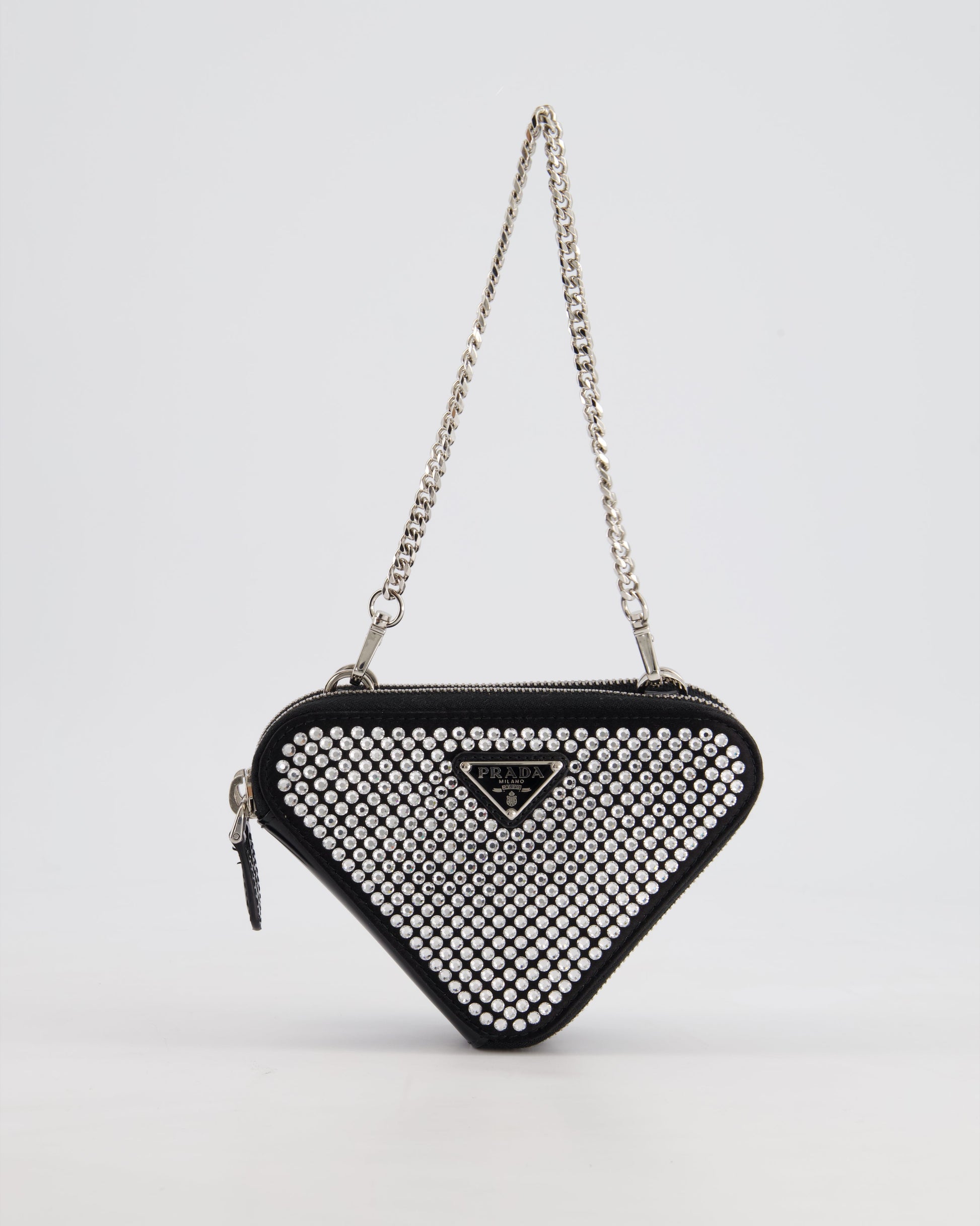 Prada Black Triangular Embellished Satin and Leather Mini-Pouch Bag with Crystals and Removable Straps