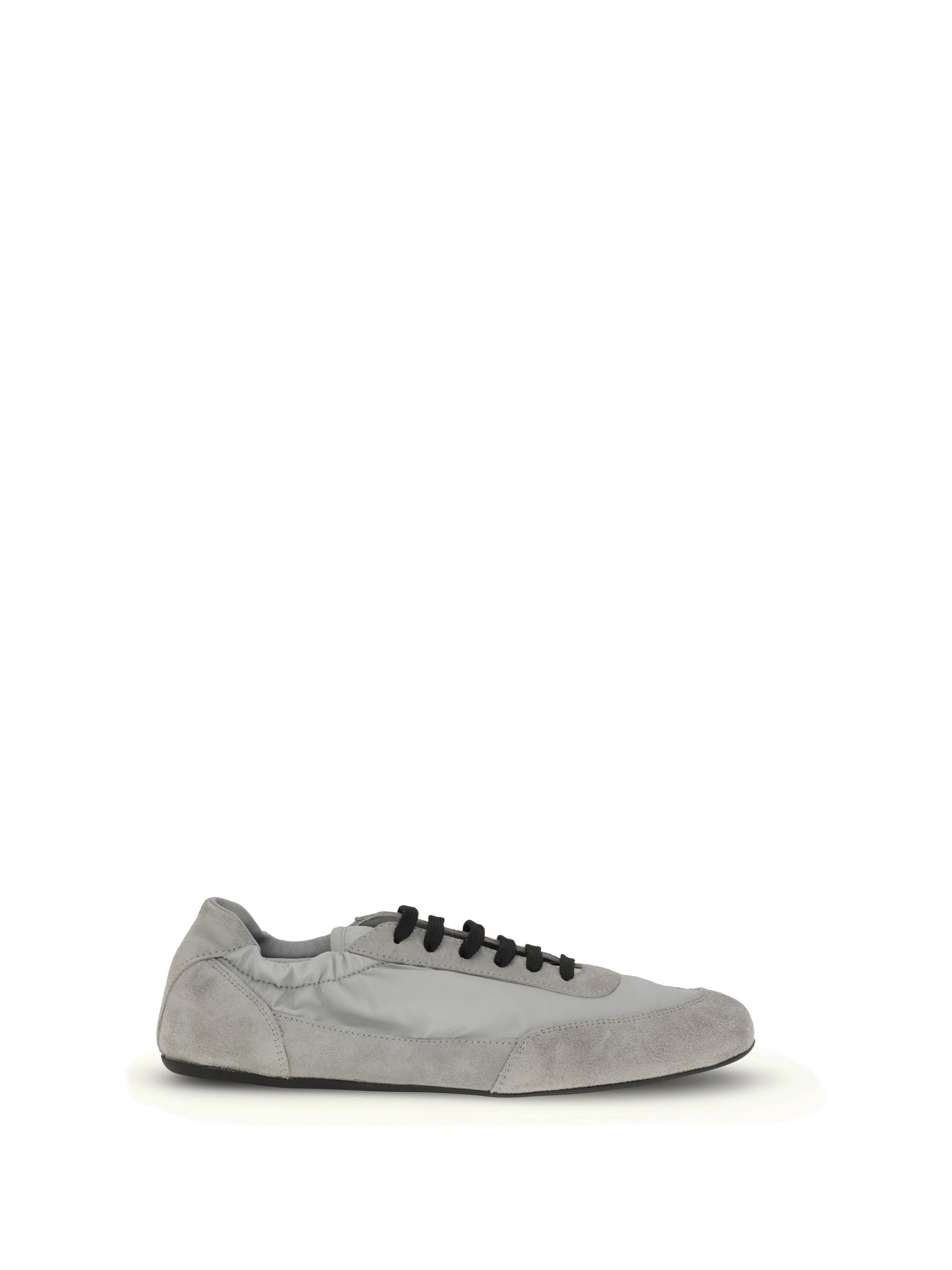 Prada's Sneakers feature a round toe and suede details, with front lace-up closure for a comfortable fit. The brand's iconic monogram can be seen in contrast on the front, while the elasticized ankle lap ensures added comfort. The flat rubber sole provides stability and durability, completing the look with a distinctive style touch.