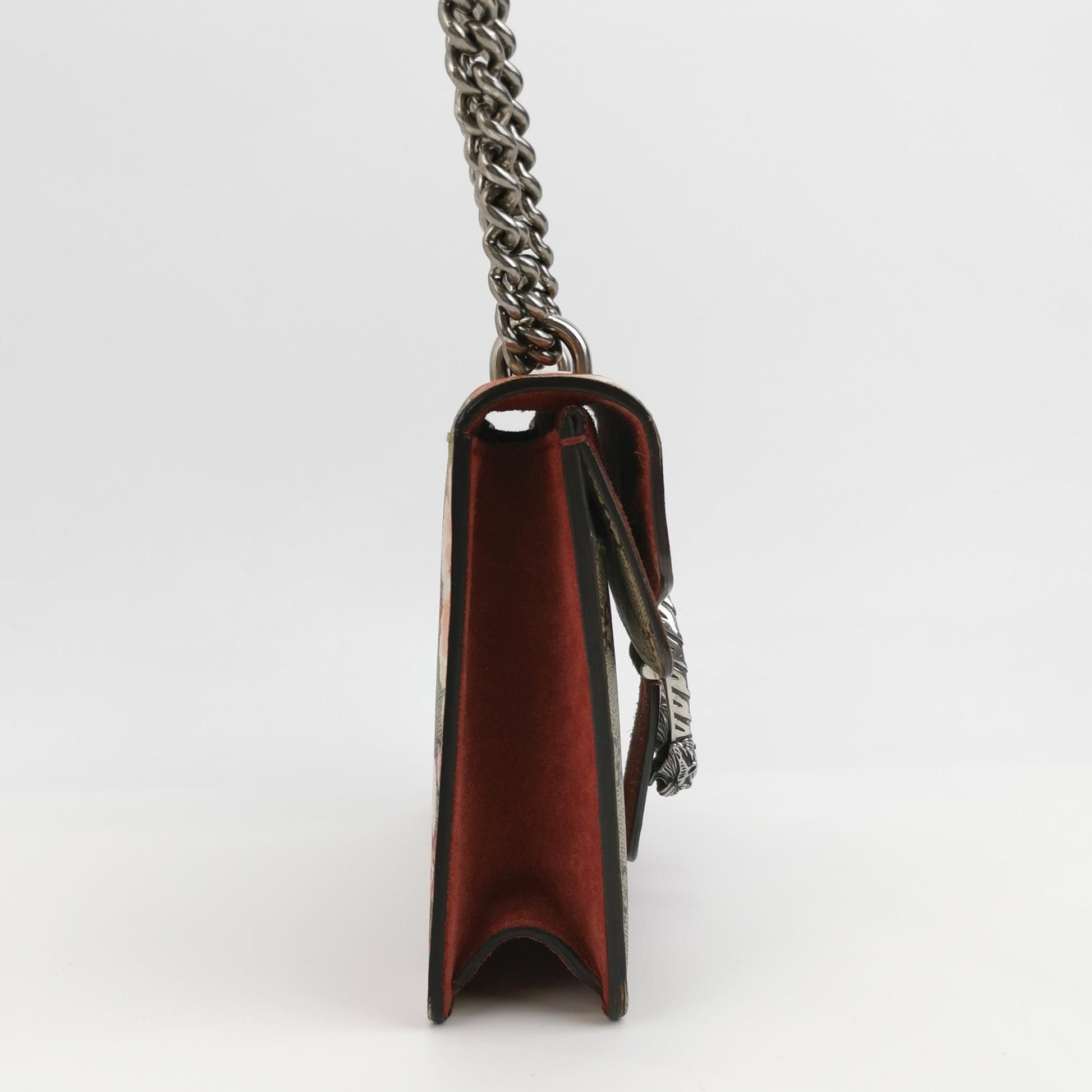 | Introducing the Preloved Gucci Dionysus Mini Bag, a luxurious accessory that combines elegance with a bold floral print on suede material. This mini bag features a distinctive double tiger head clasp, measuring 20.5 x 16 x 6 cm, perfect for carrying your essentials. Rated 9.5/10 for condition, it shows minimal signs of wear, such as slight overall stains and minor hardware wear, maintaining an excellent state. The bag comes with a dust bag, ensuring its preservation. Elevate your style with this iconic Gucci piece. | |