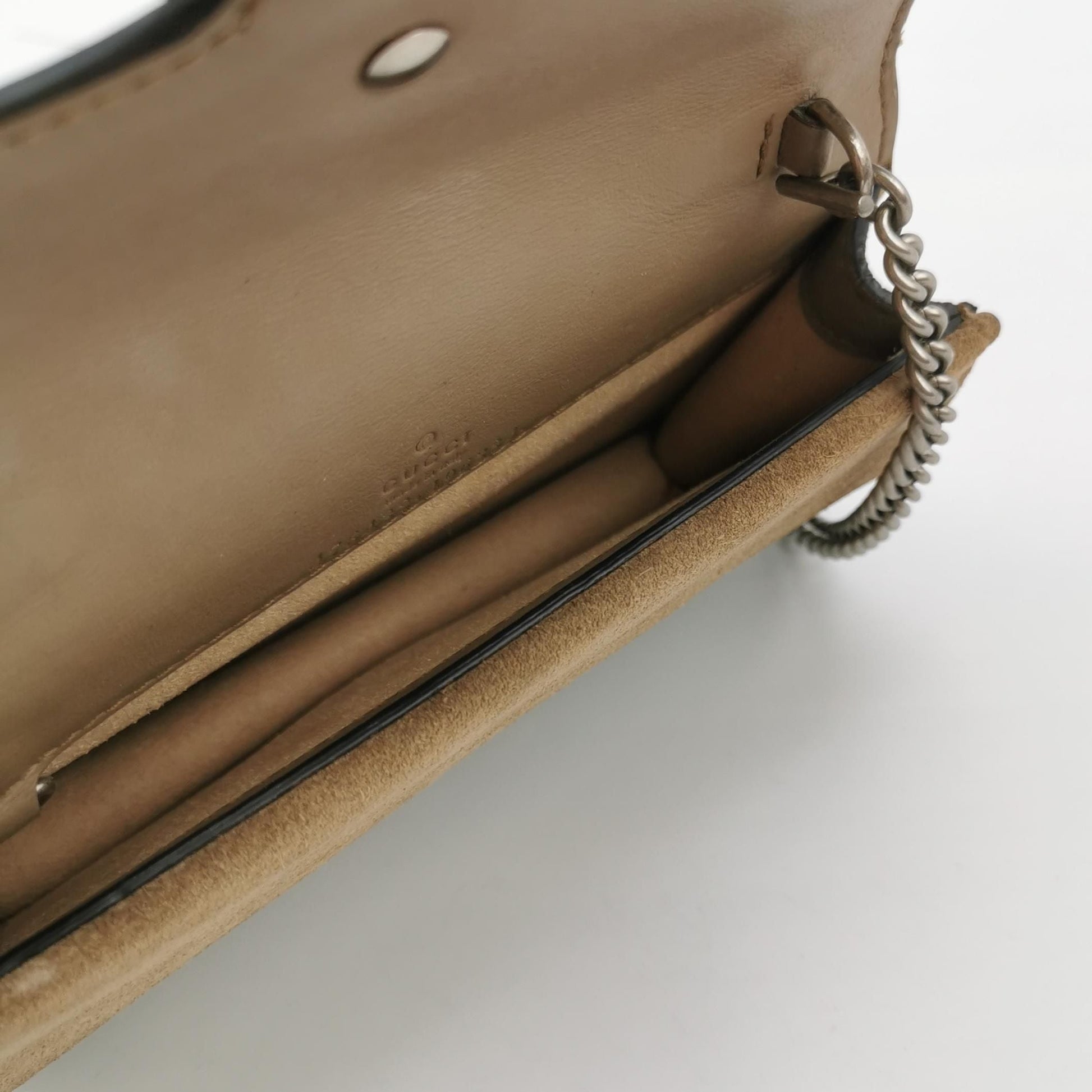 | Introducing the Preloved Gucci Dionysus Mini GG Supreme Crossbody Bag, a luxurious accessory for the fashion-forward woman. This exquisite bag features the iconic GG Supreme pattern with a double tiger head buckle closure, crafted from a combination of PU and suede materials. Measuring 16.5 x 10.5 x 2.5 cm, it's the perfect size for your essentials. The bag comes with a non-adjustable strap (126 cm in length) and removable decorative accessories. Rated 9.5/10 for condition, this bag shows minimal signs of wear, maintaining its elegance and style. A must-have for any Gucci enthusiast. | |