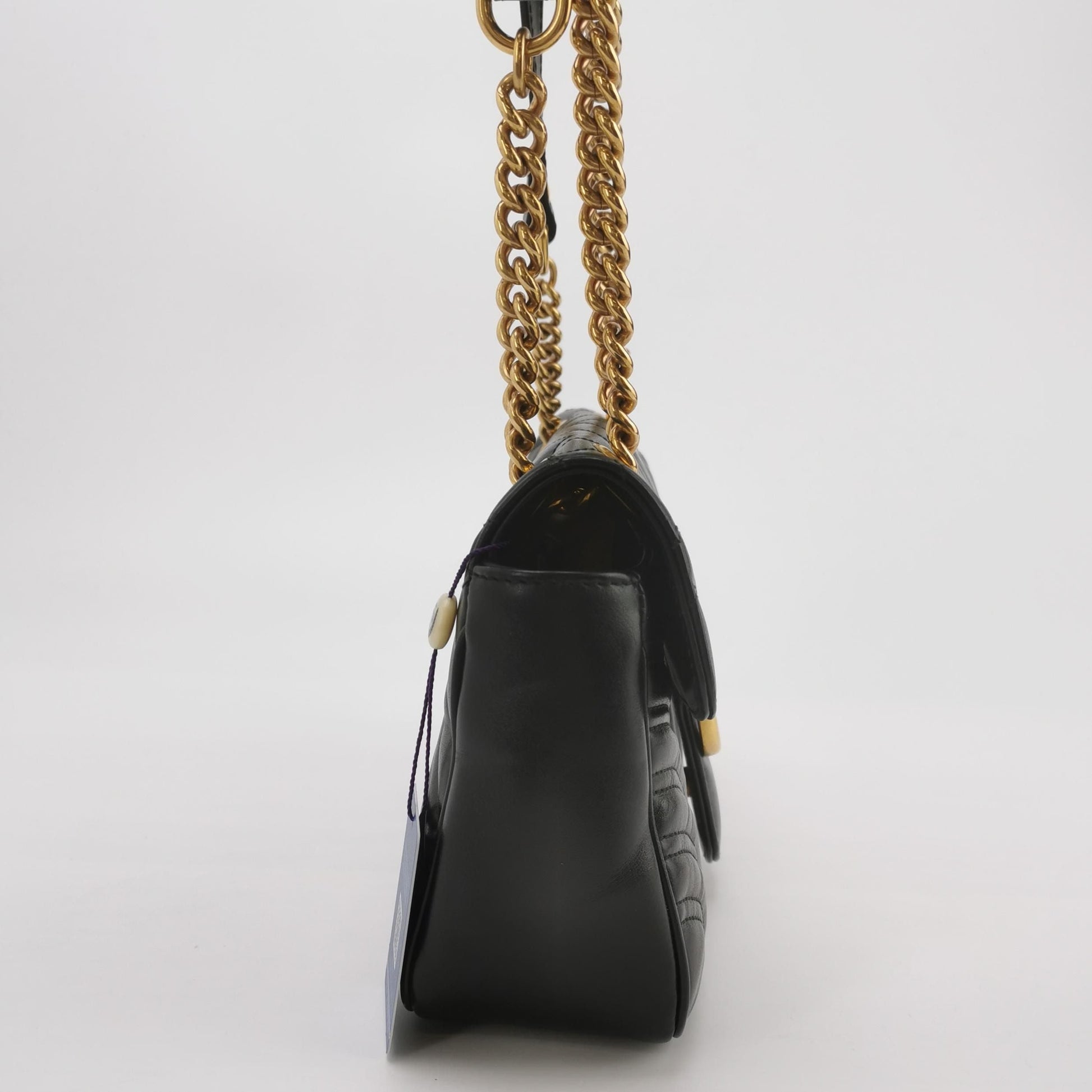 Introducing the Preloved Gucci GG Marmont Shoulder Bag, a luxurious accessory for the fashion-forward woman. Crafted from high-quality leather with a distinctive V-stitch quilted pattern and adorned with the iconic Double G logo, this elegant bag measures 25 x 15.5 x 7 cm, perfect for your daily essentials. The bag features a flap closure and gold hardware, adding a touch of sophistication. Rated 9.0/10 for condition, this preloved piece shows normal signs of use, including minor scratches and wear, but remains in very good shape. Elevate your wardrobe with this timeless Gucci masterpiece. |