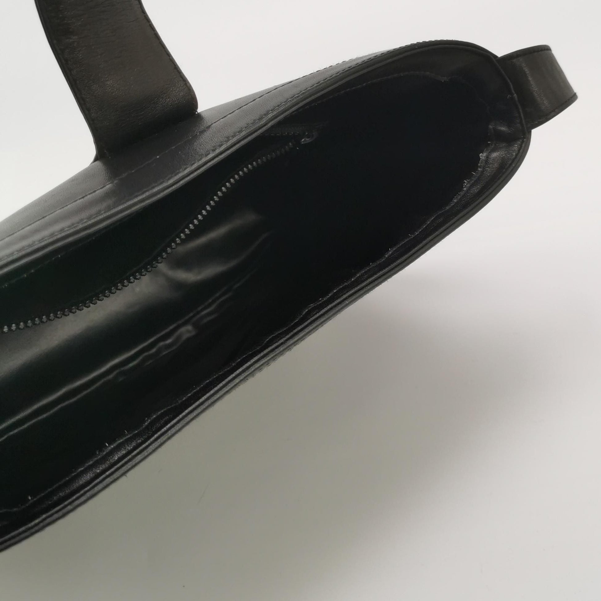Slight deformation, overall wear on hardware, color touch-ups inside, slight strap deformation and wear