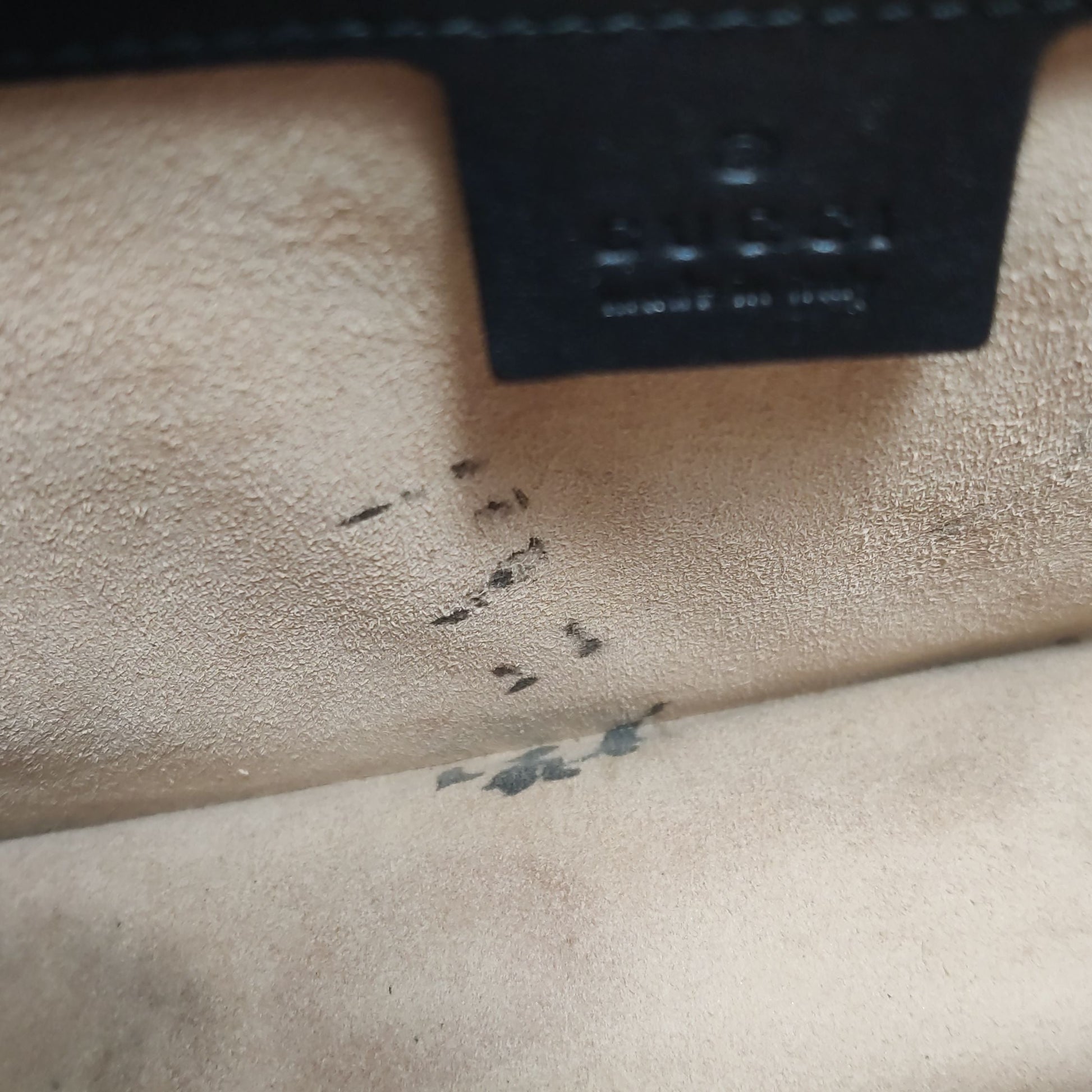 Minor overall wear on the body, slight wear on the hardware, moderate stains inside, slight deformation of the strap, slight wrinkles at the bottom, slight cracking of edge paint