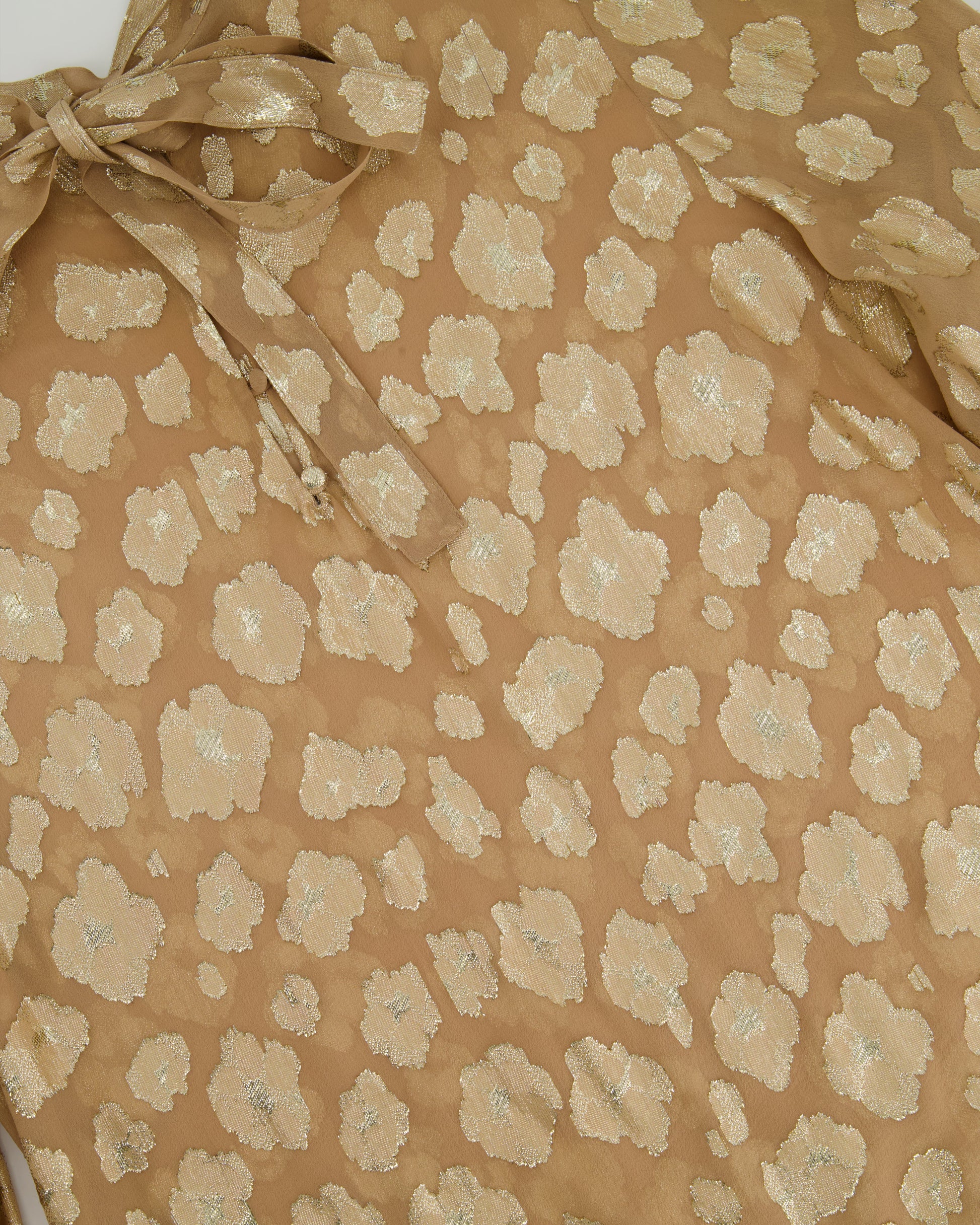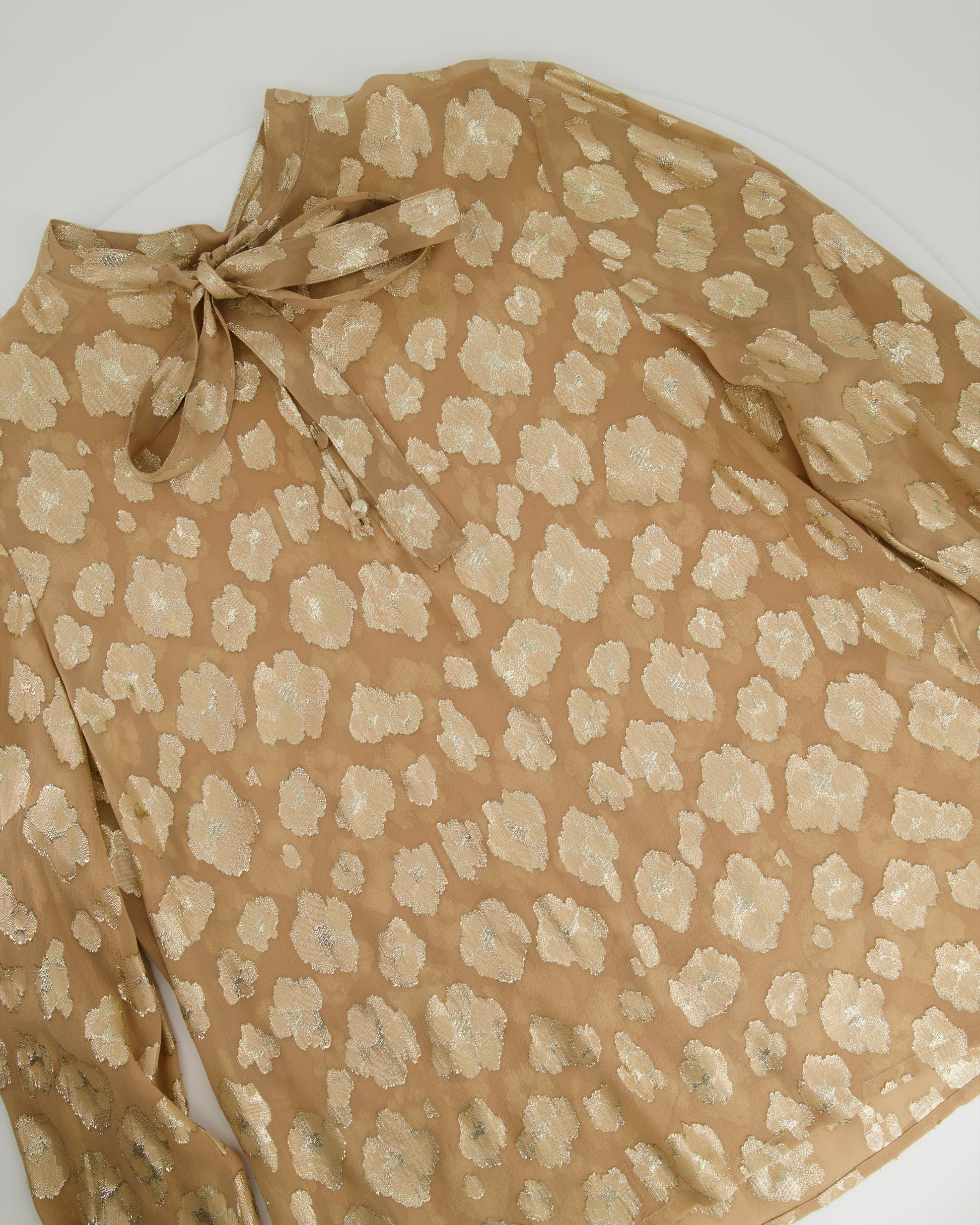 Saint Laurent Beige, Metallic Gold Floral Print Blouse with Tie Neck Size FR 40 (UK 12)