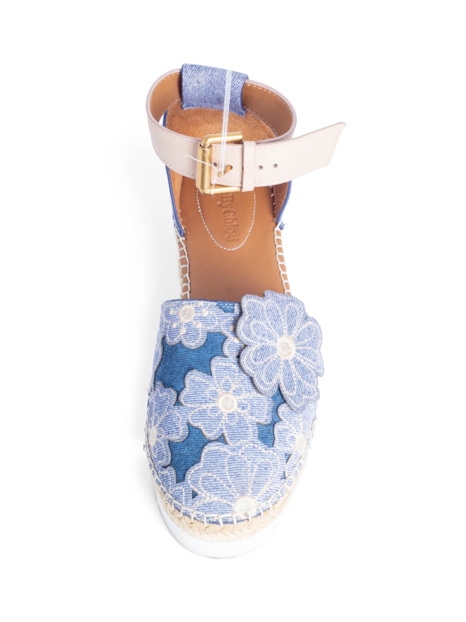 See by Chloe Floral Denim Ankle Strap Espadrilles Platform Sandals Blue