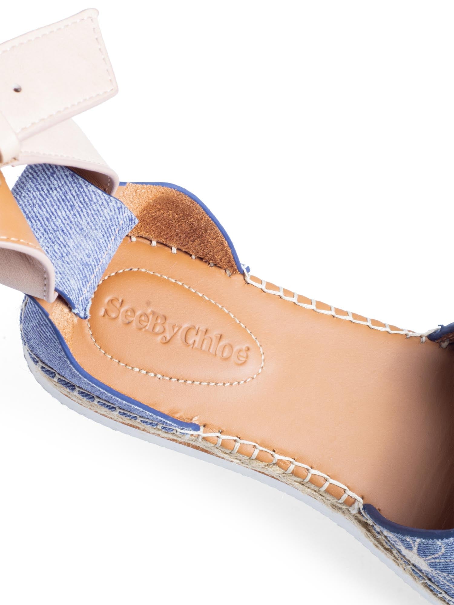See by Chloe Espadrilles or . These platform sandals are in a blue denim with a floral design encompassing the closed round toe silhouette. They feature genuine leather ankle straps with a buckle closure and a brown padded leather insole. They also feature a textured synthetic outsole sitting below the hand-woven raffia platform.