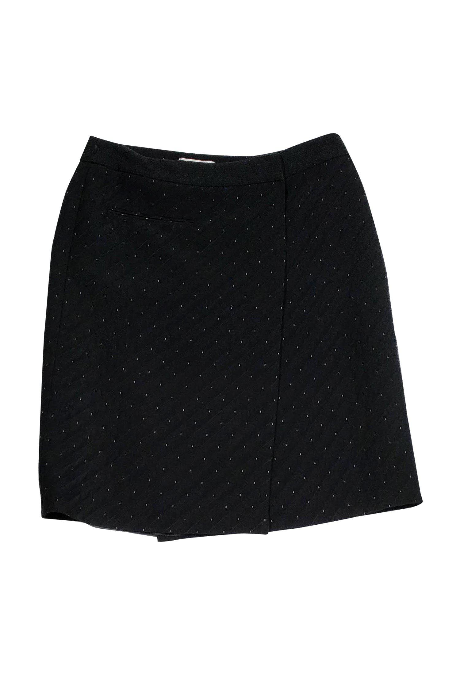 This chic Valentino skirt is made with small pink threads on the fabric. It features an easy-to-wear wrap style silhouette. It can be worn to the office with a button down blouse and blazer. Add flats to complete the look.