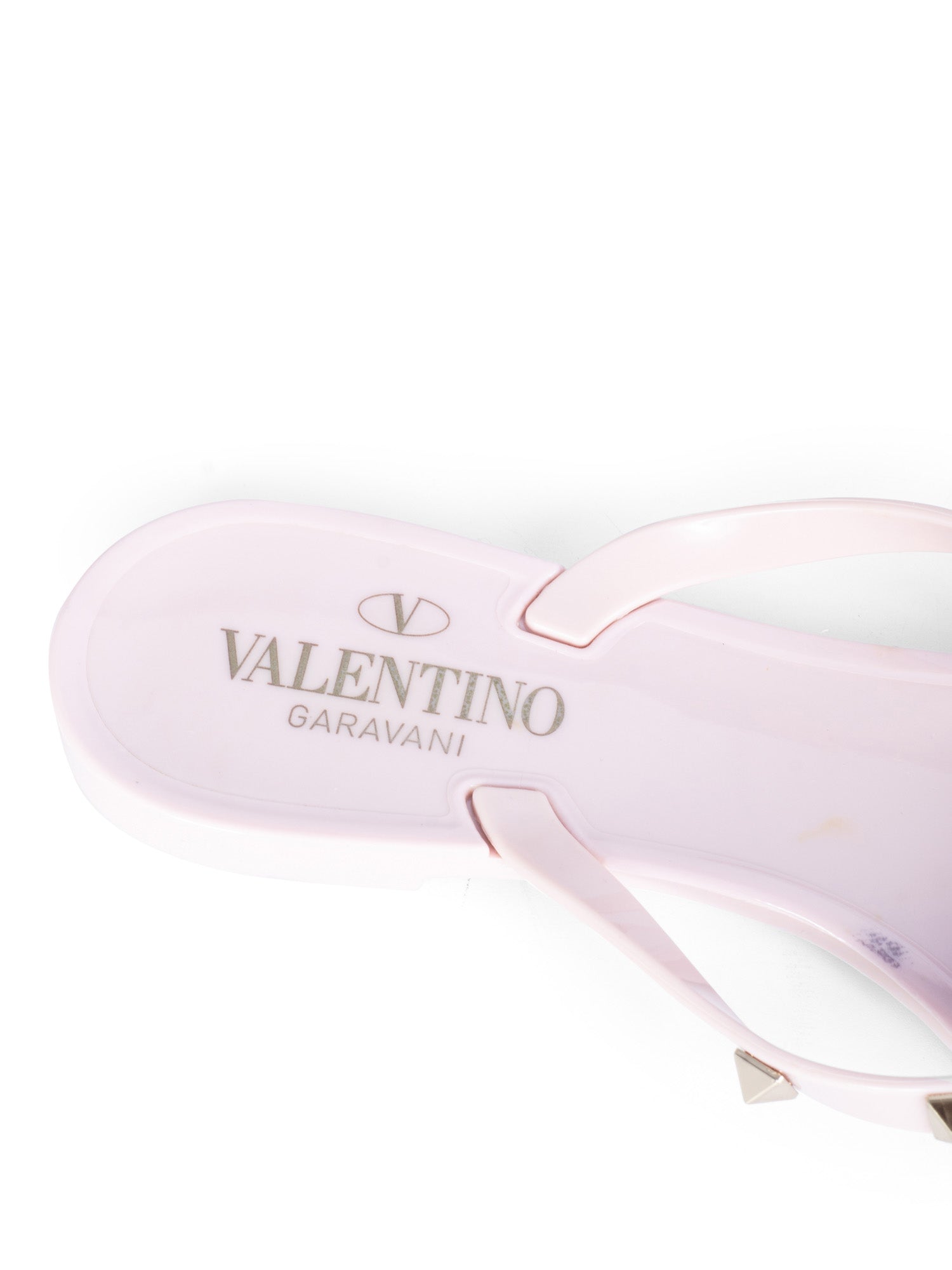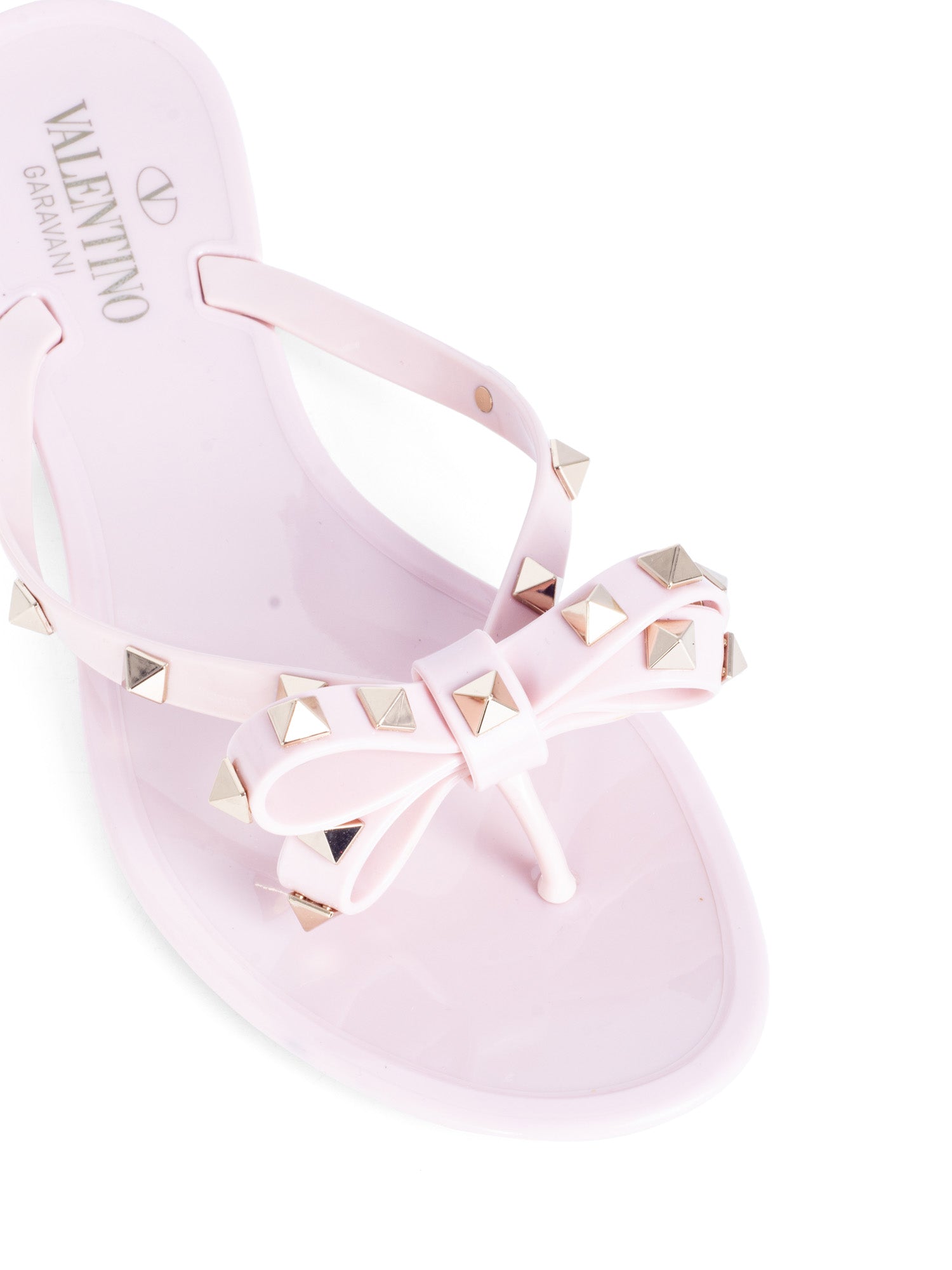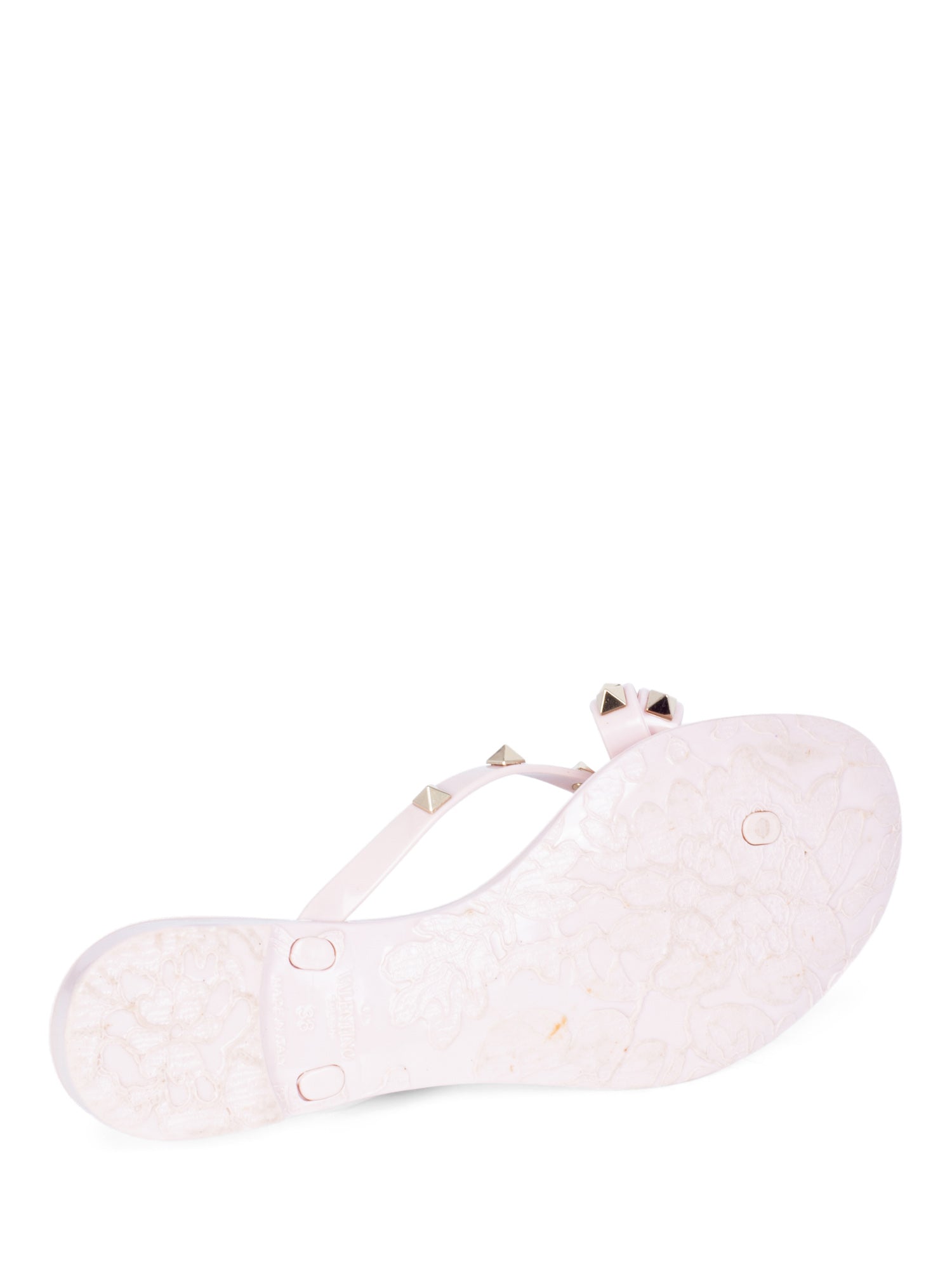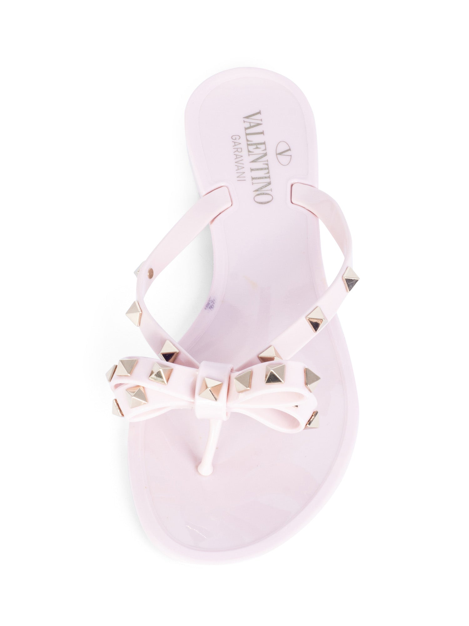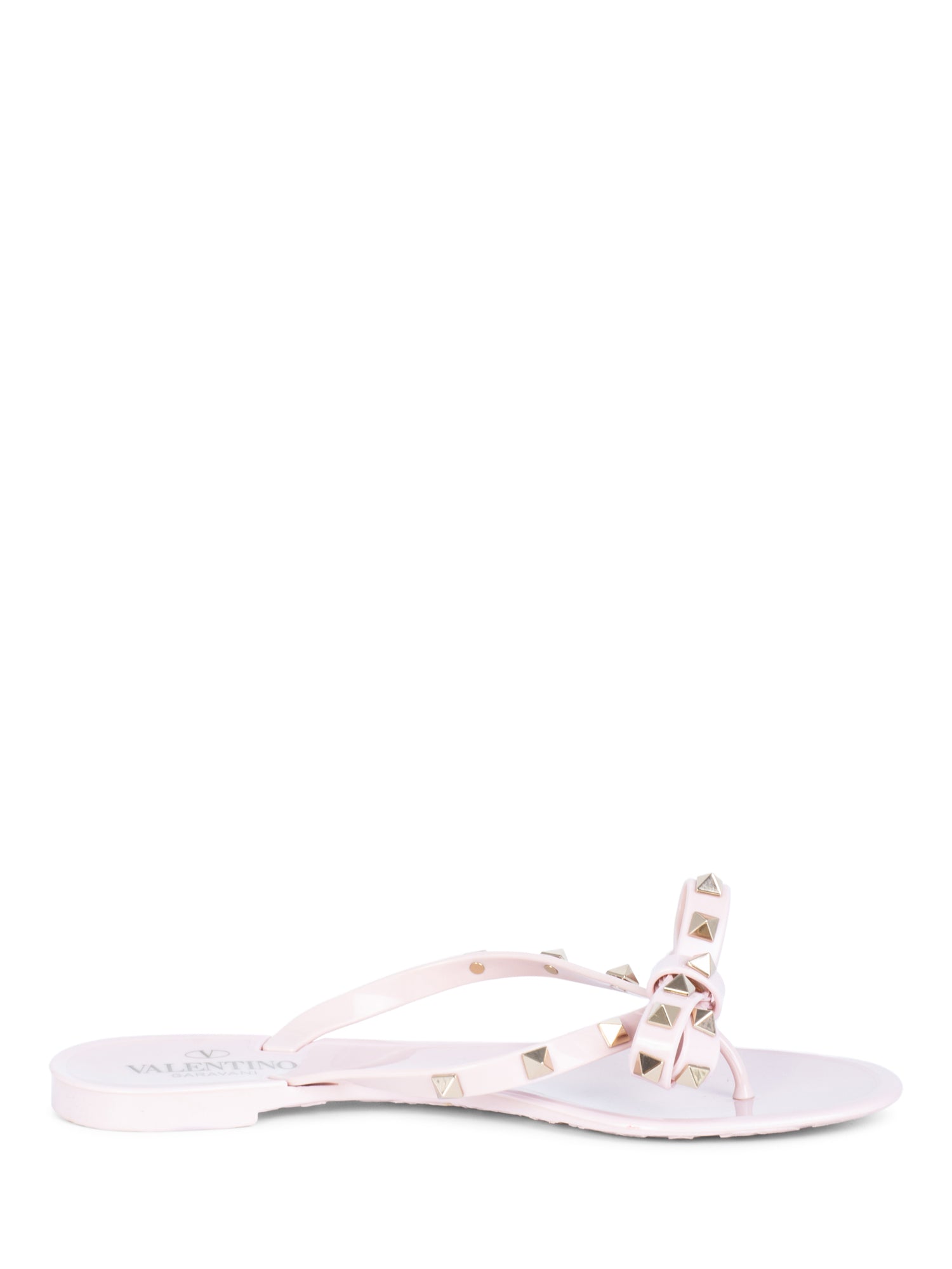 Valentino Studded Thong Sandals or . These Valentino sandals are in blush pink color resin with gold tone studs throughout the straps. These sandals feature a bow design.