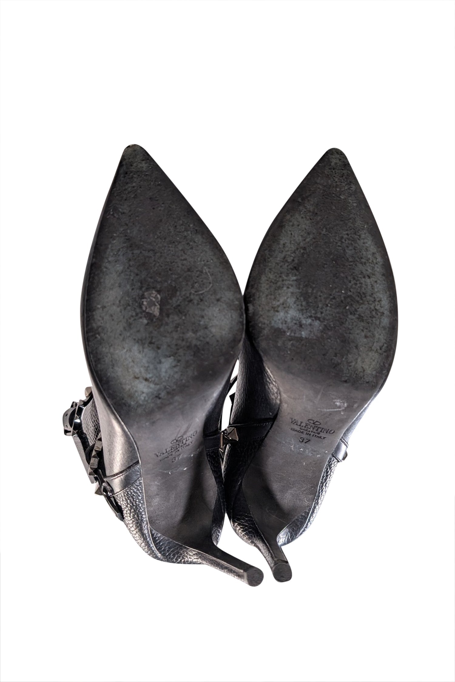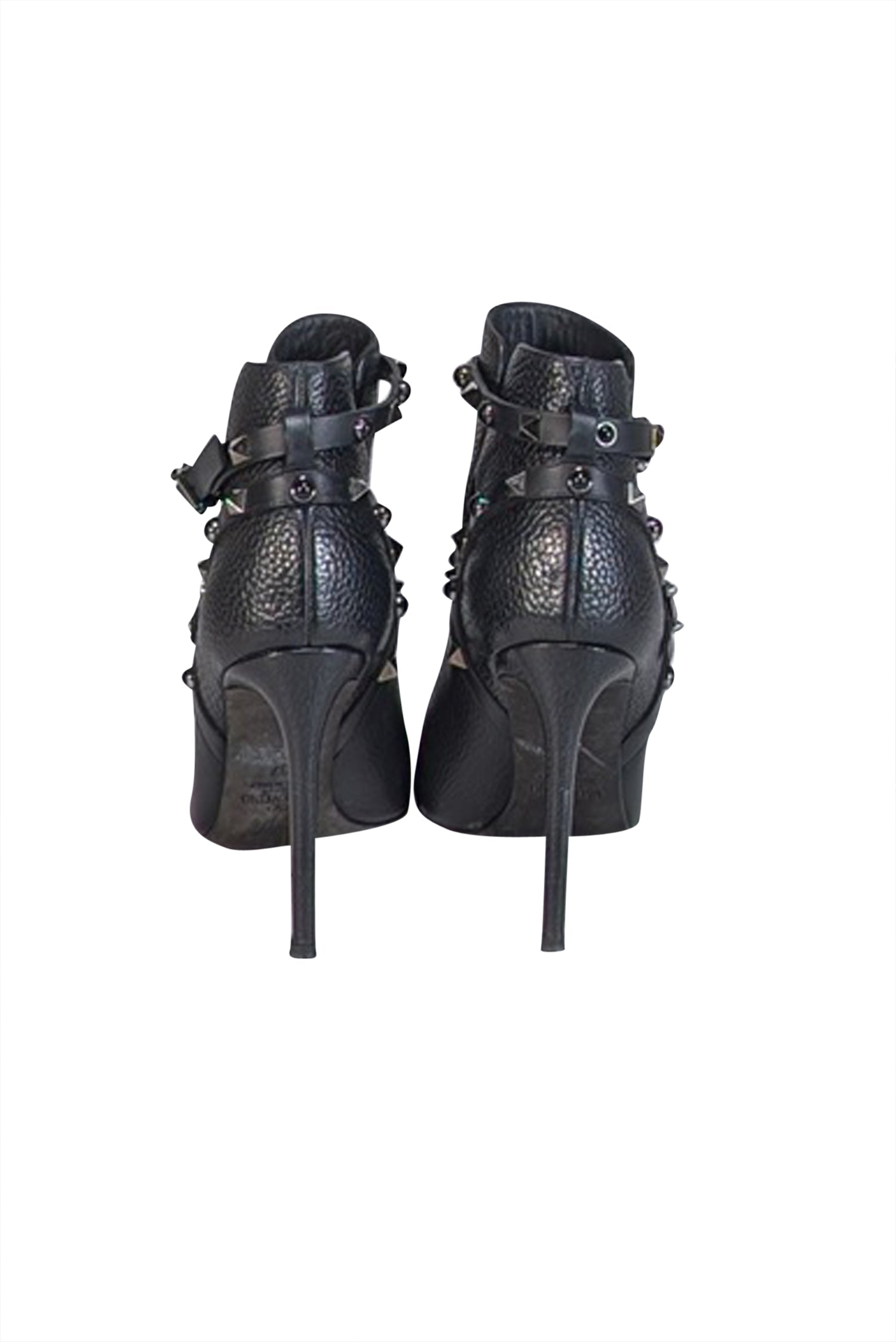 Valentino - Black Pebbled Leather Studded Trim Short Heel Boots Sz 7