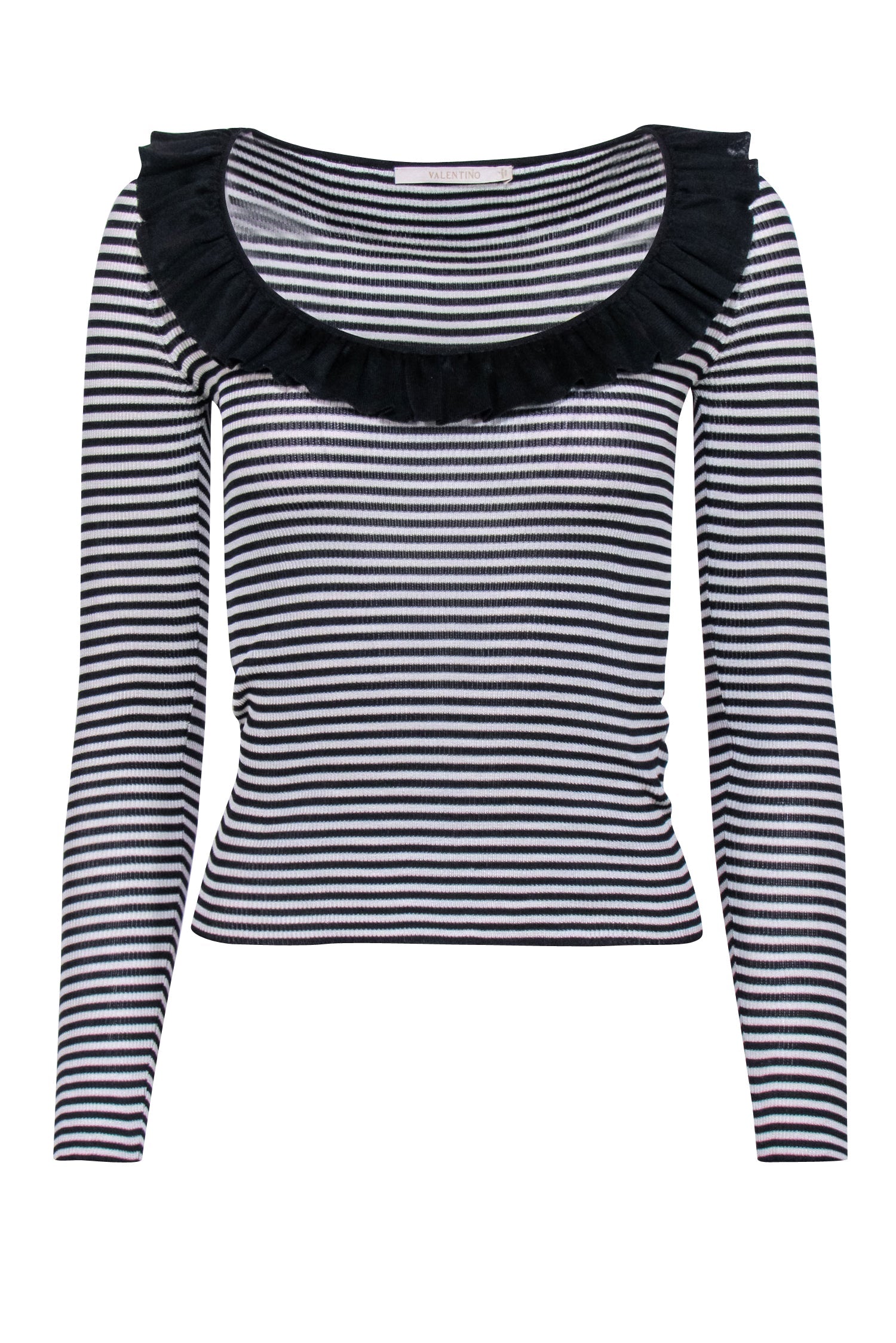 Valentino - Black & White Stripe Ribbed Knit w/ Ruffle Neck Top Sz M
