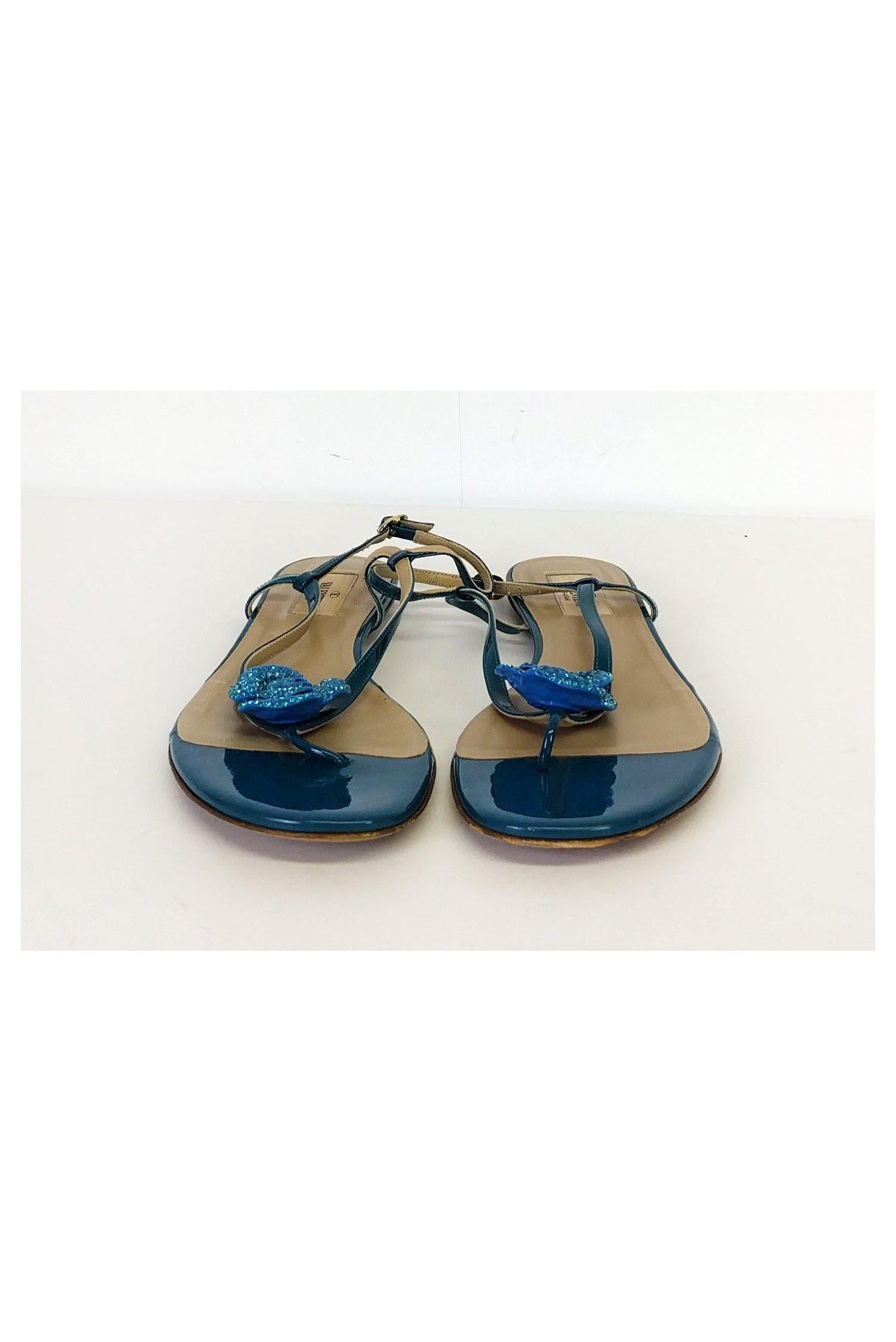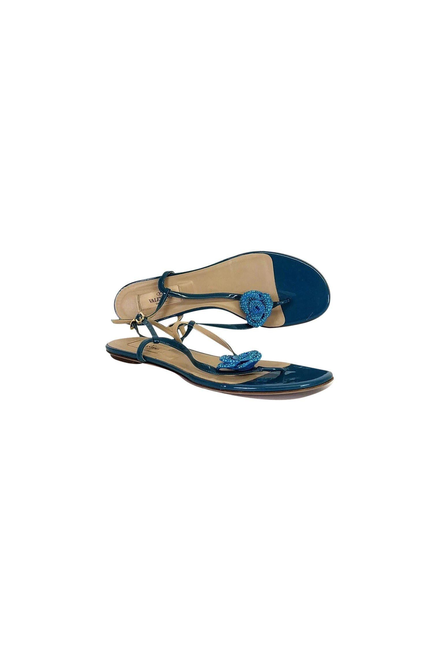 Take these chic sandals on your next vacation getaway. Great to pair with dresses, they are designed with a sleek patent leather upper. A sweet rhinestone flower adorns the front.
