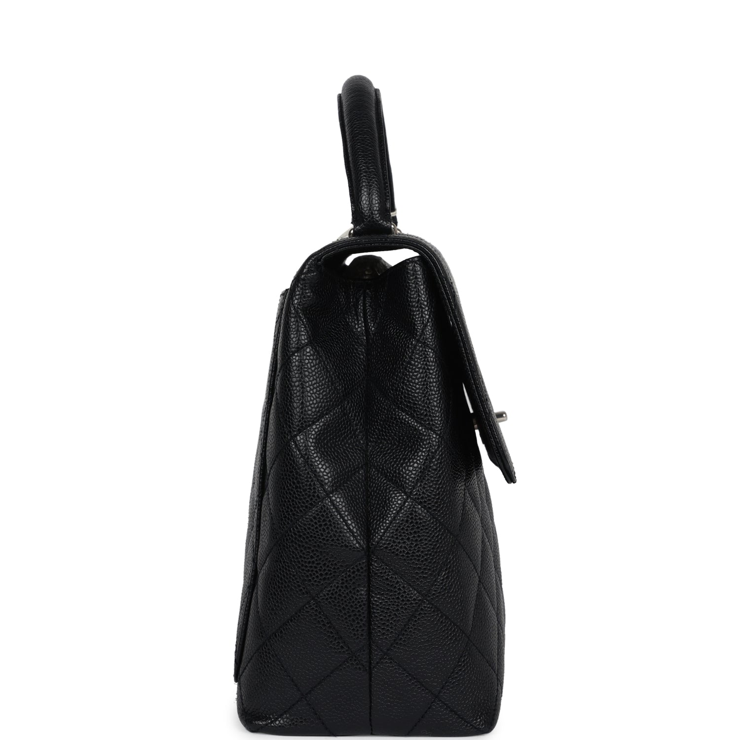 This vintage Chanel Kelly Top Handle Flap Bag is in black caviar leather with silver hardware, featuring the signature CC turnlock closure with front flap, half moon back pocket and a black rolled top handle.