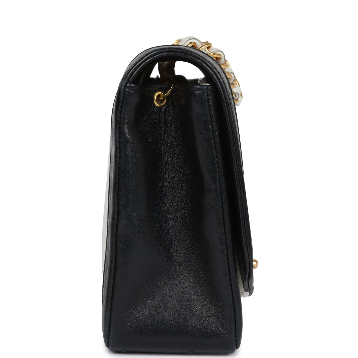This vintage Medium Diana flap bag is in white and back lambskin leather with gold hardware, featuring a front flap with CC turnlock closure, and adjustable interwoven gold plated chain link and white leather shoulder/crossbody strap.