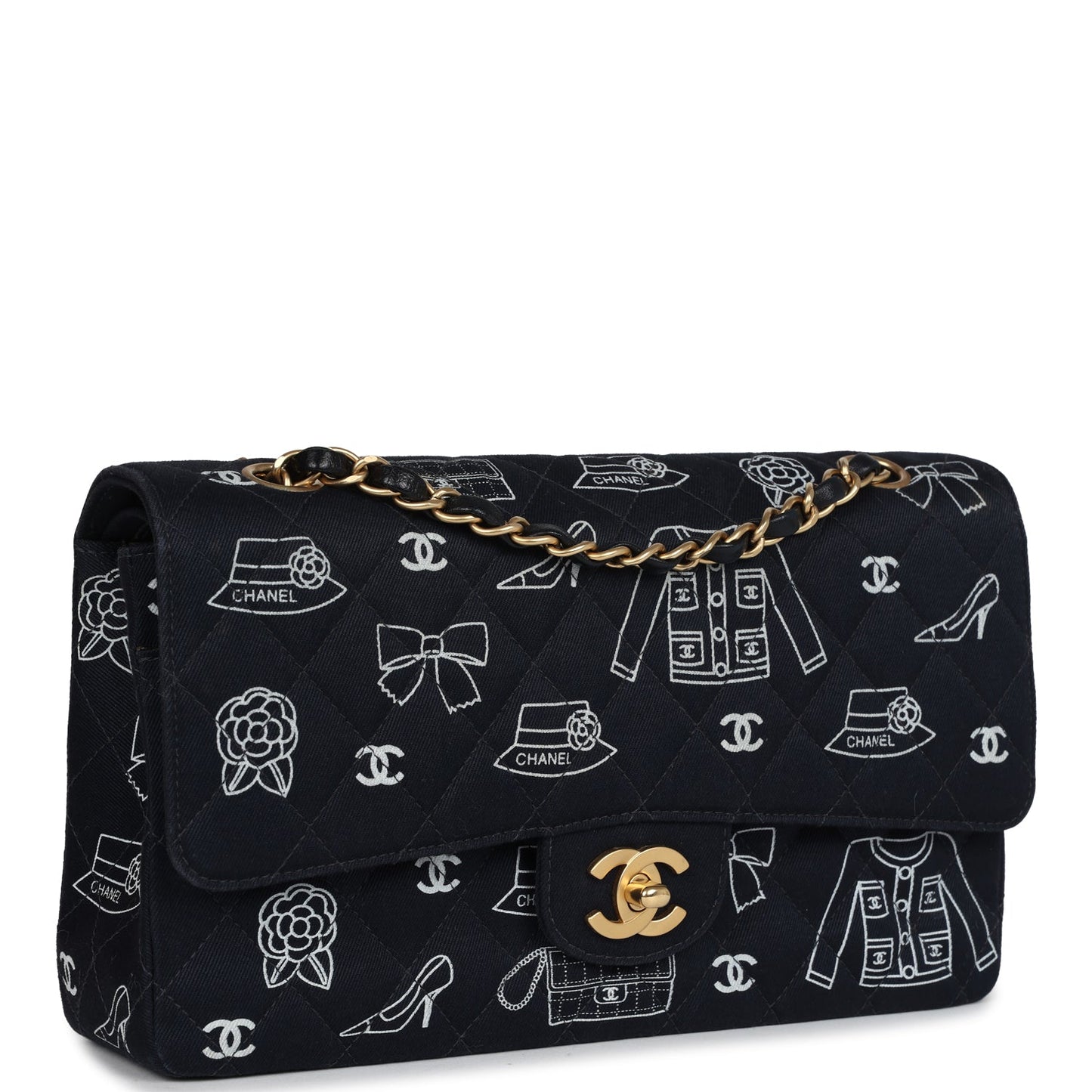 Vintage Chanel Medium Icon Print Double Flap Bag Navy Canvas Brushed Gold Hardware