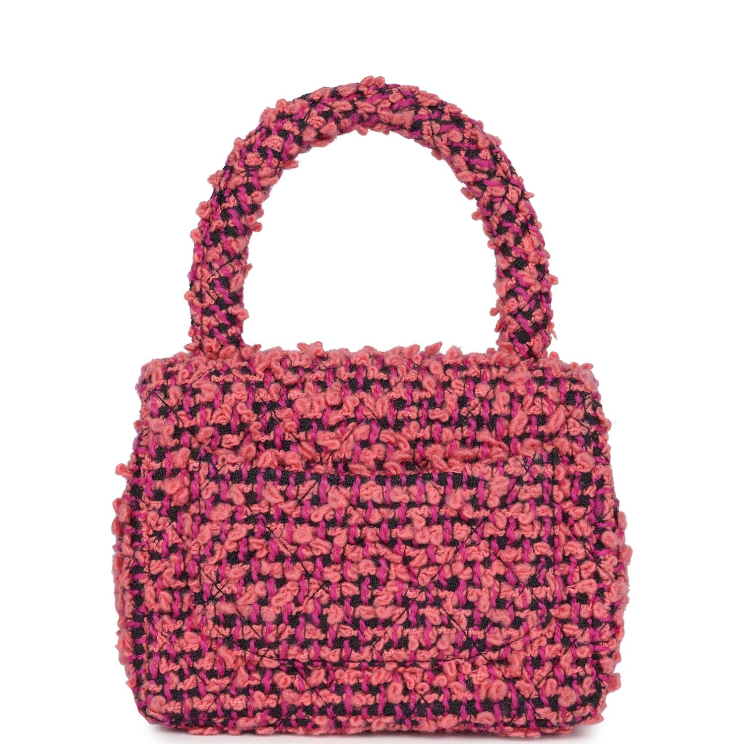 Vintage Chanel Micro Kelly Child Flap Bag Pink and Black Tweed Boucle Gold Hardware