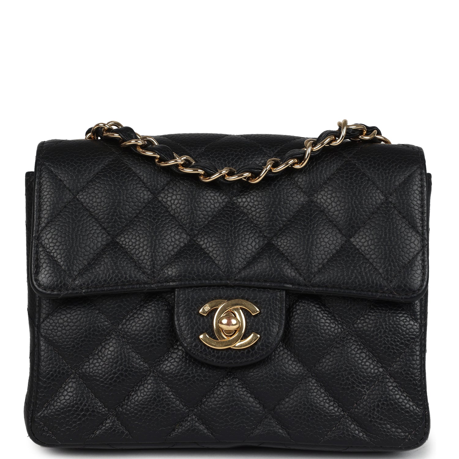 This vintage Mini Square Flap Bag is in black caviar leather with gold tone hardware and has a front flap with signature CC turnlock closure, rear half moon pocket, single interwoven black leather and gold tone chain link shoulder strap.