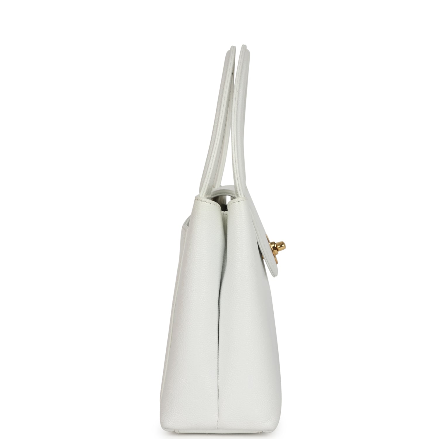 This vintage Chanel Small Top Handle Kelly is in white caviar leather with gold-tone hardware, featuring tonal stitching, has a front tab with CC turnlock closure, back exterior pocket and two flat top handles.